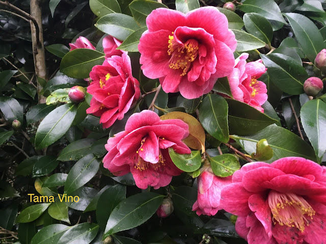 Les Cotoneasters, lauriers du Portugal et différents Viburnums aux fleurs parfumées, et au fil de la visite, Cornus et les nombreux magnolias qui se font toujours admirer, les cognassiers, pommiers malus, allée d Hortensias et bien d'autres qui se mêlent aux Camellias.