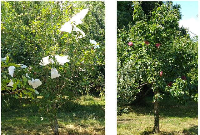 Ensuite ce fût l'ensachage de quelques fruits, pour tester cette technique qui devrait permettre d'éviter les piqures d'insectes qui les font pourrir prématurément (résultats en septembre).